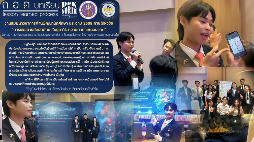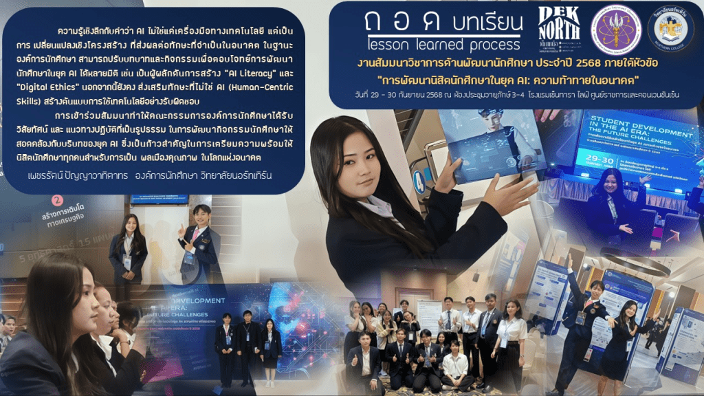 การเข้าร่วมสัมมนาทำให้คณะกรรมการองค์การนักศึกษาได้รับ วิสัยทัศน์ และ แนวทางปฏิบัติที่เป็นรูปธรรม ในการพัฒนากิจกรรมนักศึกษาให้สอดคล้องกับบริบทของยุค AI ซึ่งเป็นก้าวสำคัญในการเตรียมความพร้อมให้นิสิตนักศึกษาทุกคนสำหรับการเป็น พลเมืองคุณภาพ ในโลกแห่งอนาคตเพชรรัตน์ ปัญญาวาทิตาทร องค์การนักศึกษา วิทยาลัยนอร์ทเทิร์น